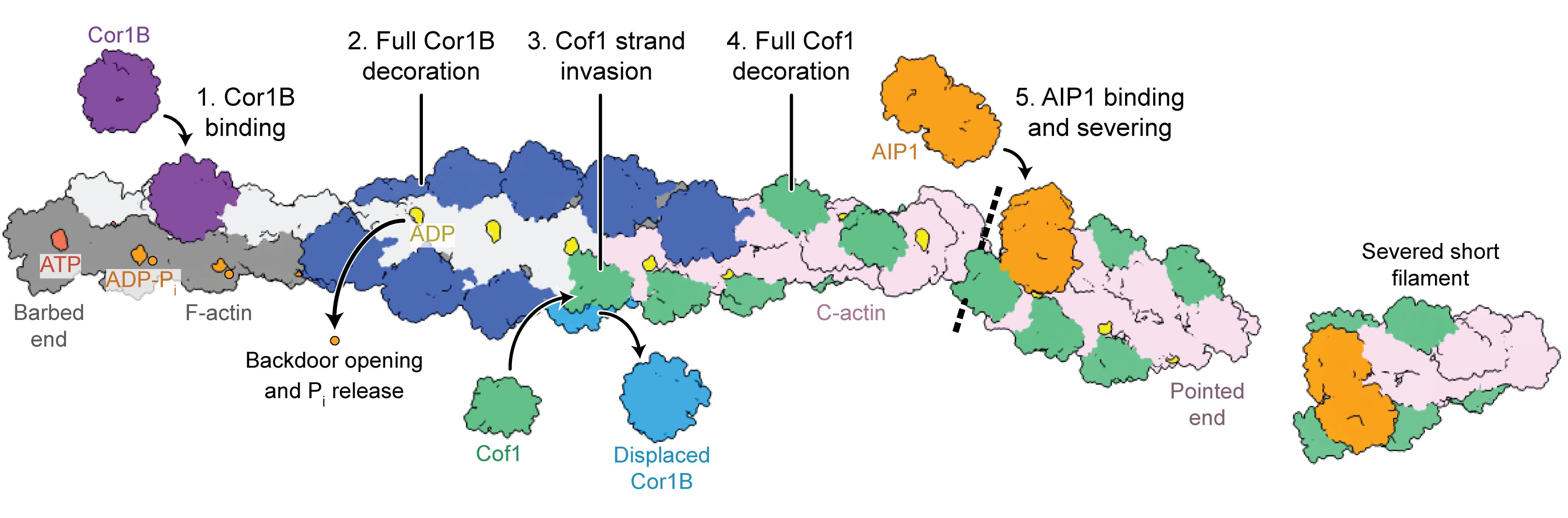 First, coronin (Cor1B, purple and blue) binds to the actin filament (grey and pink). This facilitates the binding of cofilin (Cof1, green) to the filament and leads to the release of coronin. Finally, AIP1 (orange) engages cofilin-bound actin to sever the filament, resulting in rapid disassembly. In other words, AIP1 breaks the filament and splits it into two shorter fragments.